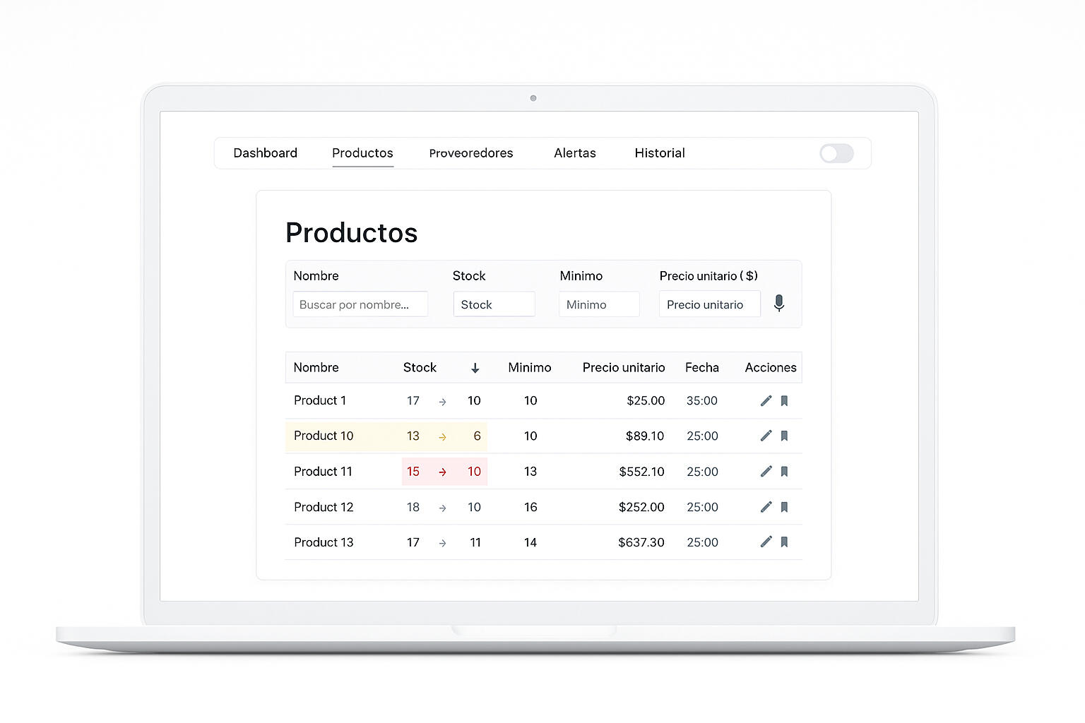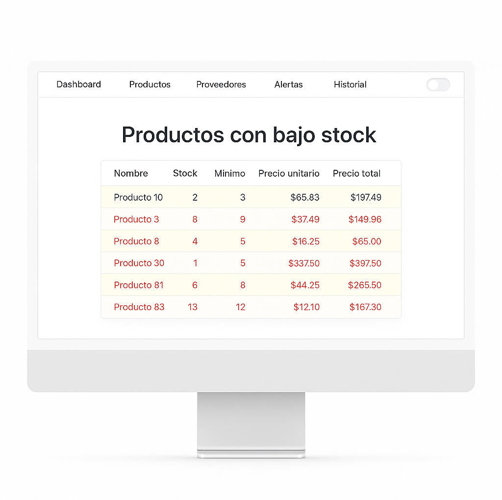 Gestioná tu inventario de forma simple y eficiente. El sistema se instala en segundos y ofrece una interfaz clara e intuitiva, con modo claro u oscuro. Permite agregar, editar y controlar productos y proveedores fácilmente, registrando cada movimiento con fecha y motivo. Además, te alerta automáticamente cuando el stock está por agotarse. Funciona sin conexión y está pensado para adaptarse a cualquier usuario, sin necesidad de conocimientos técnicos.